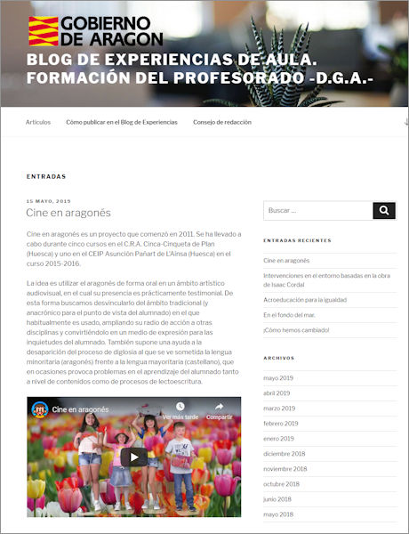 El “blog de experiencias de aula” de Formación del Profesorado del Gobierno de Aragón ha publicau un artículo sobre el nuestro proyeto “Cine en Aragonés”. Esta web recopila troballos en las aulas de la comunidá interesantes ta que puedan conoixelos atros docéns y tomá ideas ta las suyas escuelas. Podez leyelo punchando en la foto u aquí.
